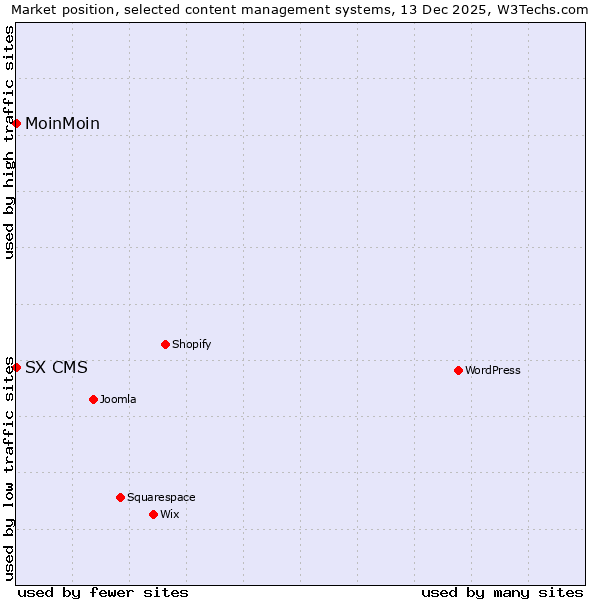 TechnologiesContent ManagementServer-side Languages Client-side Languages JavaScript Libraries CSS Frameworks Web Servers Web Panels Operating Systems Web Hosting Data Centers Reverse Proxies DNS Servers Email Servers SSL Certificate Authorities Content Delivery Traffic Analysis Tools Advertising Networks Tag Managers Social Widgets Site Elements Structured Data Markup Languages Character Encodings Image File Formats Top Level Domains Server Locations Content Languages ComparisonCompare with other | Technologies > Content Management > Technology usage comparison Comparison of the usage statistics of MoinMoin vs. SX CMS for websitesThis report shows the usage statistics of MoinMoin vs. SX CMS as content management system on the web. See technologies overview for explanations on the methodologies used in the surveys. Our reports are updated daily. Usage and market shareThis diagram shows the percentages of websites using the selected technologies. How to read the diagram: