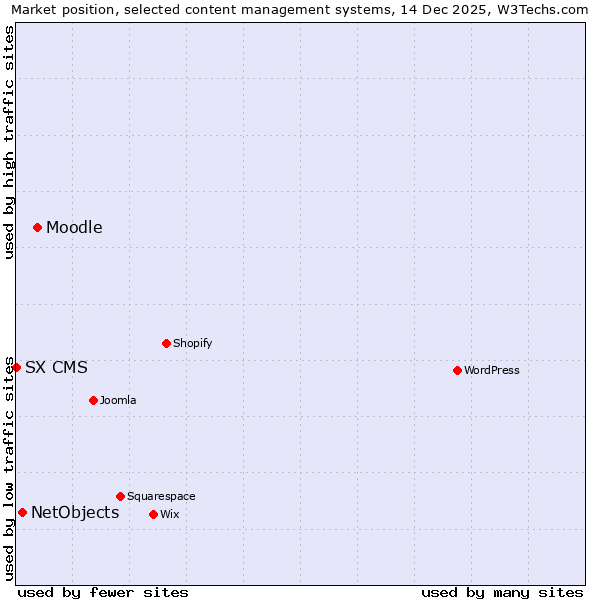 TechnologiesContent ManagementServer-side Languages Client-side Languages JavaScript Libraries CSS Frameworks Web Servers Web Panels Operating Systems Web Hosting Data Centers Reverse Proxies DNS Servers Email Servers SSL Certificate Authorities Content Delivery Traffic Analysis Tools Advertising Networks Tag Managers Social Widgets Site Elements Structured Data Markup Languages Character Encodings Image File Formats Top Level Domains Server Locations Content Languages | Technologies > Content Management > Technology usage comparison Comparison of the usage statistics of Moodle vs. NetObjects vs. SX CMS for websitesThis report shows the usage statistics of Moodle vs. NetObjects vs. SX CMS as content management system on the web. See technologies overview for explanations on the methodologies used in the surveys. Our reports are updated daily. Usage and market shareThis diagram shows the percentages of websites using the selected technologies. How to read the diagram: