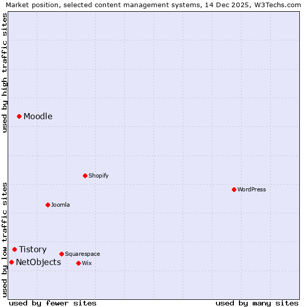 TechnologiesContent ManagementServer-side Languages Client-side Languages JavaScript Libraries CSS Frameworks Web Servers Web Panels Operating Systems Web Hosting Data Centers Reverse Proxies DNS Servers Email Servers SSL Certificate Authorities Content Delivery Traffic Analysis Tools Advertising Networks Tag Managers Social Widgets Site Elements Structured Data Markup Languages Character Encodings Image File Formats Top Level Domains Server Locations Content Languages | Technologies > Content Management > Technology usage comparison Comparison of the usage statistics of Moodle vs. Tistory vs. NetObjects for websitesThis report shows the usage statistics of Moodle vs. Tistory vs. NetObjects as content management system on the web. See technologies overview for explanations on the methodologies used in the surveys. Our reports are updated daily. Usage and market shareThis diagram shows the percentages of websites using the selected technologies. How to read the diagram: