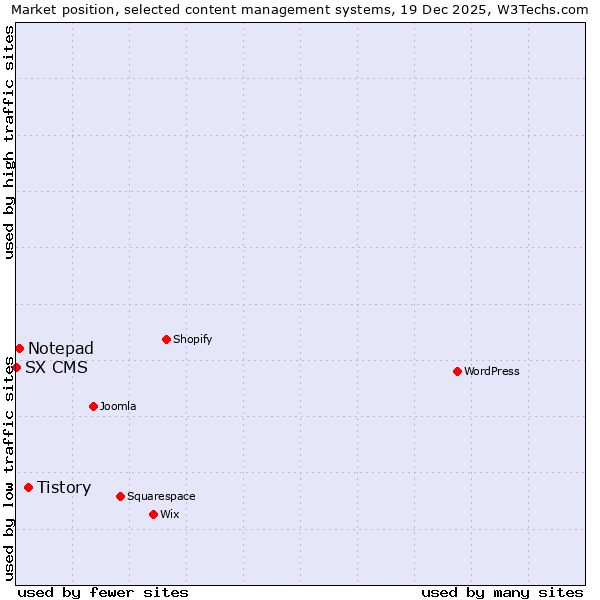 TechnologiesContent ManagementServer-side Languages Client-side Languages JavaScript Libraries CSS Frameworks Web Servers Web Panels Operating Systems Web Hosting Data Centers Reverse Proxies DNS Servers Email Servers SSL Certificate Authorities Content Delivery Traffic Analysis Tools Advertising Networks Tag Managers Social Widgets Site Elements Structured Data Markup Languages Character Encodings Image File Formats Top Level Domains Server Locations Content Languages | Technologies > Content Management > Technology usage comparison Comparison of the usage statistics of Tistory vs. Notepad vs. SX CMS for websitesThis report shows the usage statistics of Tistory vs. Notepad vs. SX CMS as content management system on the web. See technologies overview for explanations on the methodologies used in the surveys. Our reports are updated daily. Usage and market shareThis diagram shows the percentages of websites using the selected technologies. How to read the diagram: