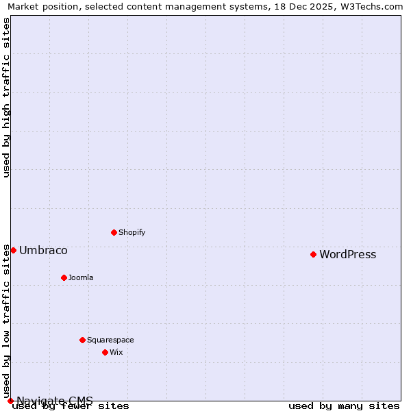 TechnologiesContent ManagementServer-side Languages Client-side Languages JavaScript Libraries CSS Frameworks Web Servers Web Panels Operating Systems Web Hosting Data Centers Reverse Proxies DNS Servers Email Servers SSL Certificate Authorities Content Delivery Traffic Analysis Tools Advertising Networks Tag Managers Social Widgets Site Elements Structured Data Markup Languages Character Encodings Image File Formats Top Level Domains Server Locations Content Languages | Technologies > Content Management > Technology usage comparison Comparison of the usage statistics of WordPress vs. Umbraco vs. Navigate CMS for websitesThis report shows the usage statistics of WordPress vs. Umbraco vs. Navigate CMS as content management system on the web. See technologies overview for explanations on the methodologies used in the surveys. Our reports are updated daily. Usage and market shareThis diagram shows the percentages of websites using the selected technologies. How to read the diagram: