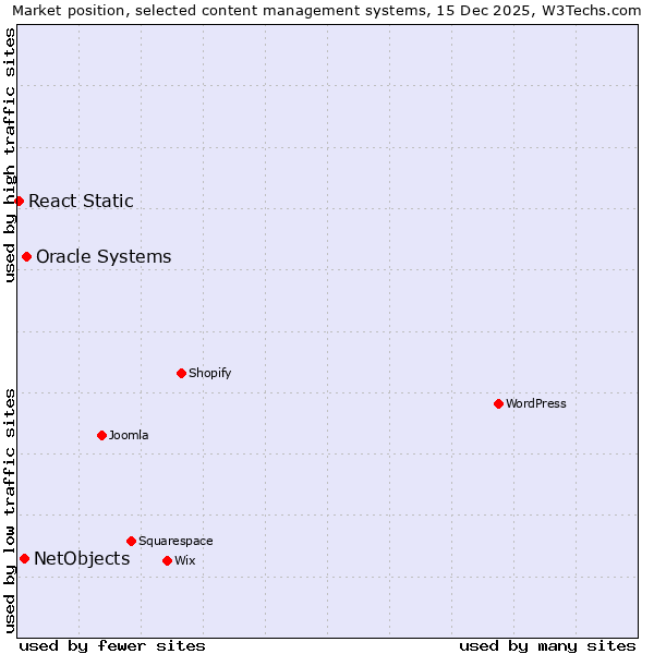 TechnologiesContent ManagementServer-side Languages Client-side Languages JavaScript Libraries CSS Frameworks Web Servers Web Panels Operating Systems Web Hosting Data Centers Reverse Proxies DNS Servers Email Servers SSL Certificate Authorities Content Delivery Traffic Analysis Tools Advertising Networks Tag Managers Social Widgets Site Elements Structured Data Markup Languages Character Encodings Image File Formats Top Level Domains Server Locations Content Languages | Technologies > Content Management > Technology usage comparison Comparison of the usage statistics of Oracle Systems vs. NetObjects vs. React Static for websitesThis report shows the usage statistics of Oracle Systems vs. NetObjects vs. React Static as content management system on the web. See technologies overview for explanations on the methodologies used in the surveys. Our reports are updated daily. Usage and market shareThis diagram shows the percentages of websites using the selected technologies. How to read the diagram: