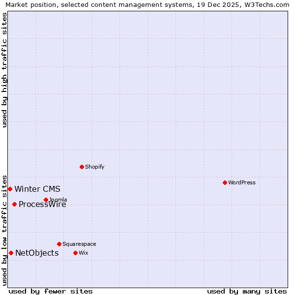 TechnologiesContent ManagementServer-side Languages Client-side Languages JavaScript Libraries CSS Frameworks Web Servers Web Panels Operating Systems Web Hosting Data Centers Reverse Proxies DNS Servers Email Servers SSL Certificate Authorities Content Delivery Traffic Analysis Tools Advertising Networks Tag Managers Social Widgets Site Elements Structured Data Markup Languages Character Encodings Image File Formats Top Level Domains Server Locations Content Languages | Technologies > Content Management > Technology usage comparison Comparison of the usage statistics of ProcessWire vs. NetObjects vs. Winter CMS for websitesThis report shows the usage statistics of ProcessWire vs. NetObjects vs. Winter CMS as content management system on the web. See technologies overview for explanations on the methodologies used in the surveys. Our reports are updated daily. Usage and market shareThis diagram shows the percentages of websites using the selected technologies. How to read the diagram: