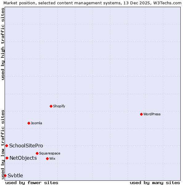 TechnologiesContent ManagementServer-side Languages Client-side Languages JavaScript Libraries CSS Frameworks Web Servers Web Panels Operating Systems Web Hosting Data Centers Reverse Proxies DNS Servers Email Servers SSL Certificate Authorities Content Delivery Traffic Analysis Tools Advertising Networks Tag Managers Social Widgets Site Elements Structured Data Markup Languages Character Encodings Image File Formats Top Level Domains Server Locations Content Languages | Technologies > Content Management > Technology usage comparison Comparison of the usage statistics of NetObjects vs. SchoolSitePro vs. Svbtle for websitesThis report shows the usage statistics of NetObjects vs. SchoolSitePro vs. Svbtle as content management system on the web. See technologies overview for explanations on the methodologies used in the surveys. Our reports are updated daily. Usage and market shareThis diagram shows the percentages of websites using the selected technologies. How to read the diagram: