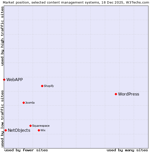 TechnologiesContent ManagementServer-side Languages Client-side Languages JavaScript Libraries CSS Frameworks Web Servers Web Panels Operating Systems Web Hosting Data Centers Reverse Proxies DNS Servers Email Servers SSL Certificate Authorities Content Delivery Traffic Analysis Tools Advertising Networks Tag Managers Social Widgets Site Elements Structured Data Markup Languages Character Encodings Image File Formats Top Level Domains Server Locations Content Languages | Technologies > Content Management > Technology usage comparison Comparison of the usage statistics of WordPress vs. NetObjects vs. WebAPP for websitesThis report shows the usage statistics of WordPress vs. NetObjects vs. WebAPP as content management system on the web. See technologies overview for explanations on the methodologies used in the surveys. Our reports are updated daily. Usage and market shareThis diagram shows the percentages of websites using the selected technologies. How to read the diagram: