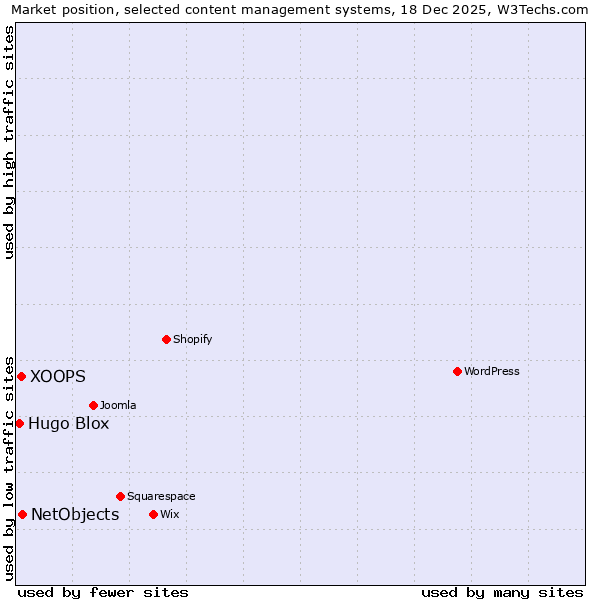TechnologiesContent ManagementServer-side Languages Client-side Languages JavaScript Libraries CSS Frameworks Web Servers Web Panels Operating Systems Web Hosting Data Centers Reverse Proxies DNS Servers Email Servers SSL Certificate Authorities Content Delivery Traffic Analysis Tools Advertising Networks Tag Managers Social Widgets Site Elements Structured Data Markup Languages Character Encodings Image File Formats Top Level Domains Server Locations Content Languages | Technologies > Content Management > Technology usage comparison Comparison of the usage statistics of NetObjects vs. XOOPS vs. Hugo Blox for websitesThis report shows the usage statistics of NetObjects vs. XOOPS vs. Hugo Blox as content management system on the web. See technologies overview for explanations on the methodologies used in the surveys. Our reports are updated daily. Usage and market shareThis diagram shows the percentages of websites using the selected technologies. How to read the diagram: