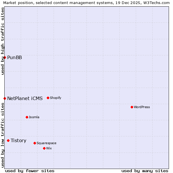 TechnologiesContent ManagementServer-side Languages Client-side Languages JavaScript Libraries CSS Frameworks Web Servers Web Panels Operating Systems Web Hosting Data Centers Reverse Proxies DNS Servers Email Servers SSL Certificate Authorities Content Delivery Traffic Analysis Tools Advertising Networks Tag Managers Social Widgets Site Elements Structured Data Markup Languages Character Encodings Image File Formats Top Level Domains Server Locations Content Languages | Technologies > Content Management > Technology usage comparison Comparison of the usage statistics of Tistory vs. NetPlanet iCMS vs. PunBB for websitesThis report shows the usage statistics of Tistory vs. NetPlanet iCMS vs. PunBB as content management system on the web. See technologies overview for explanations on the methodologies used in the surveys. Our reports are updated daily. Usage and market shareThis diagram shows the percentages of websites using the selected technologies. How to read the diagram: