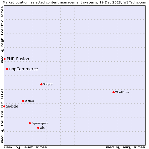 TechnologiesContent ManagementServer-side Languages Client-side Languages JavaScript Libraries CSS Frameworks Web Servers Web Panels Operating Systems Web Hosting Data Centers Reverse Proxies DNS Servers Email Servers SSL Certificate Authorities Content Delivery Traffic Analysis Tools Advertising Networks Tag Managers Social Widgets Site Elements Structured Data Markup Languages Character Encodings Image File Formats Top Level Domains Server Locations Content Languages | Technologies > Content Management > Technology usage comparison Comparison of the usage statistics of nopCommerce vs. PHP-Fusion vs. Svbtle for websitesThis report shows the usage statistics of nopCommerce vs. PHP-Fusion vs. Svbtle as content management system on the web. See technologies overview for explanations on the methodologies used in the surveys. Our reports are updated daily. Usage and market shareThis diagram shows the percentages of websites using the selected technologies. How to read the diagram: