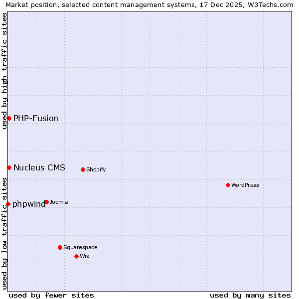 TechnologiesContent ManagementServer-side Languages Client-side Languages JavaScript Libraries CSS Frameworks Web Servers Web Panels Operating Systems Web Hosting Data Centers Reverse Proxies DNS Servers Email Servers SSL Certificate Authorities Content Delivery Traffic Analysis Tools Advertising Networks Tag Managers Social Widgets Site Elements Structured Data Markup Languages Character Encodings Image File Formats Top Level Domains Server Locations Content Languages | Technologies > Content Management > Technology usage comparison Comparison of the usage statistics of PHP-Fusion vs. Nucleus CMS vs. phpwind for websitesThis report shows the usage statistics of PHP-Fusion vs. Nucleus CMS vs. phpwind as content management system on the web. See technologies overview for explanations on the methodologies used in the surveys. Our reports are updated daily. Usage and market shareThis diagram shows the percentages of websites using the selected technologies. How to read the diagram: