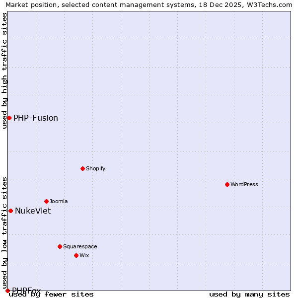 TechnologiesContent ManagementServer-side Languages Client-side Languages JavaScript Libraries CSS Frameworks Web Servers Web Panels Operating Systems Web Hosting Data Centers Reverse Proxies DNS Servers Email Servers SSL Certificate Authorities Content Delivery Traffic Analysis Tools Advertising Networks Tag Managers Social Widgets Site Elements Structured Data Markup Languages Character Encodings Image File Formats Top Level Domains Server Locations Content Languages | Technologies > Content Management > Technology usage comparison Comparison of the usage statistics of NukeViet vs. PHP-Fusion vs. PHPFox for websitesThis report shows the usage statistics of NukeViet vs. PHP-Fusion vs. PHPFox as content management system on the web. See technologies overview for explanations on the methodologies used in the surveys. Our reports are updated daily. Usage and market shareThis diagram shows the percentages of websites using the selected technologies. How to read the diagram:
