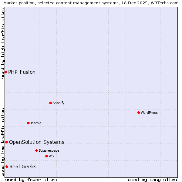 TechnologiesContent ManagementServer-side Languages Client-side Languages JavaScript Libraries CSS Frameworks Web Servers Web Panels Operating Systems Web Hosting Data Centers Reverse Proxies DNS Servers Email Servers SSL Certificate Authorities Content Delivery Traffic Analysis Tools Advertising Networks Tag Managers Social Widgets Site Elements Structured Data Markup Languages Character Encodings Image File Formats Top Level Domains Server Locations Content Languages | Technologies > Content Management > Technology usage comparison Comparison of the usage statistics of Real Geeks vs. OpenSolution Systems vs. PHP-Fusion for websitesThis report shows the usage statistics of Real Geeks vs. OpenSolution Systems vs. PHP-Fusion as content management system on the web. See technologies overview for explanations on the methodologies used in the surveys. Our reports are updated daily. Usage and market shareThis diagram shows the percentages of websites using the selected technologies. How to read the diagram: