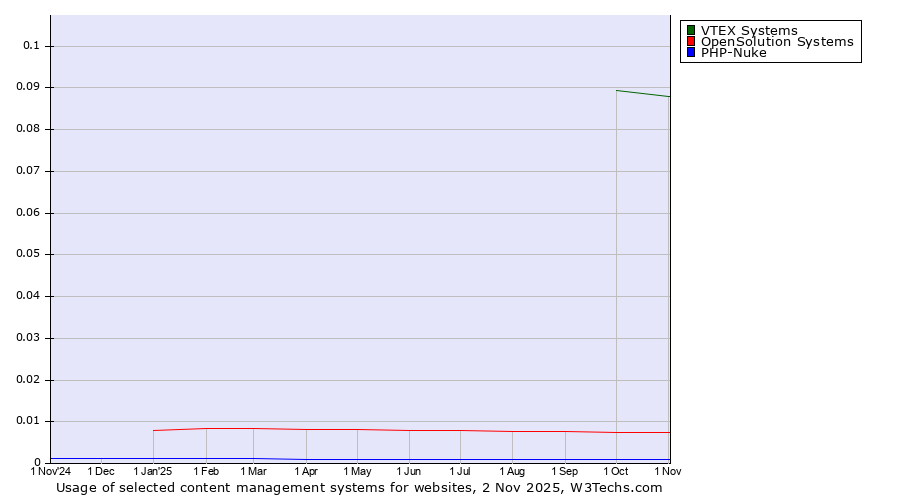 TechnologiesContent ManagementServer-side Languages Client-side Languages JavaScript Libraries CSS Frameworks Web Servers Web Panels Operating Systems Web Hosting Data Centers Reverse Proxies DNS Servers Email Servers SSL Certificate Authorities Content Delivery Traffic Analysis Tools Advertising Networks Tag Managers Social Widgets Site Elements Structured Data Markup Languages Character Encodings Image File Formats Top Level Domains Server Locations Content Languages | Technologies > Content Management > Technology usage comparison Comparison of the usage statistics of VTEX Systems vs. OpenSolution Systems vs. PHP-Nuke for websitesThis report shows the usage statistics of VTEX Systems vs. OpenSolution Systems vs. PHP-Nuke as content management system on the web. See technologies overview for explanations on the methodologies used in the surveys. Our reports are updated daily. Usage and market shareThis diagram shows the percentages of websites using the selected technologies. How to read the diagram: