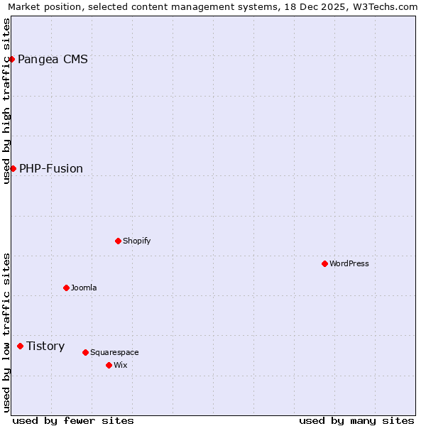 TechnologiesContent ManagementServer-side Languages Client-side Languages JavaScript Libraries CSS Frameworks Web Servers Web Panels Operating Systems Web Hosting Data Centers Reverse Proxies DNS Servers Email Servers SSL Certificate Authorities Content Delivery Traffic Analysis Tools Advertising Networks Tag Managers Social Widgets Site Elements Structured Data Markup Languages Character Encodings Image File Formats Top Level Domains Server Locations Content Languages | Technologies > Content Management > Technology usage comparison Comparison of the usage statistics of Tistory vs. PHP-Fusion vs. Pangea CMS for websitesThis report shows the usage statistics of Tistory vs. PHP-Fusion vs. Pangea CMS as content management system on the web. See technologies overview for explanations on the methodologies used in the surveys. Our reports are updated daily. Usage and market shareThis diagram shows the percentages of websites using the selected technologies. How to read the diagram: