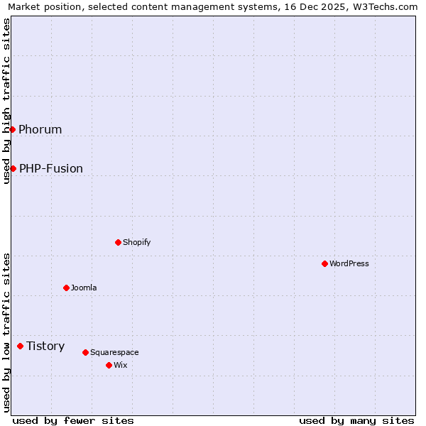 TechnologiesContent ManagementServer-side Languages Client-side Languages JavaScript Libraries CSS Frameworks Web Servers Web Panels Operating Systems Web Hosting Data Centers Reverse Proxies DNS Servers Email Servers SSL Certificate Authorities Content Delivery Traffic Analysis Tools Advertising Networks Tag Managers Social Widgets Site Elements Structured Data Markup Languages Character Encodings Image File Formats Top Level Domains Server Locations Content Languages | Technologies > Content Management > Technology usage comparison Comparison of the usage statistics of Tistory vs. PHP-Fusion vs. Phorum for websitesThis report shows the usage statistics of Tistory vs. PHP-Fusion vs. Phorum as content management system on the web. See technologies overview for explanations on the methodologies used in the surveys. Our reports are updated daily. Usage and market shareThis diagram shows the percentages of websites using the selected technologies. How to read the diagram: