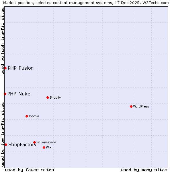 TechnologiesContent ManagementServer-side Languages Client-side Languages JavaScript Libraries CSS Frameworks Web Servers Web Panels Operating Systems Web Hosting Data Centers Reverse Proxies DNS Servers Email Servers SSL Certificate Authorities Content Delivery Traffic Analysis Tools Advertising Networks Tag Managers Social Widgets Site Elements Structured Data Markup Languages Character Encodings Image File Formats Top Level Domains Server Locations Content Languages | Technologies > Content Management > Technology usage comparison Comparison of the usage statistics of ShopFactory vs. PHP-Fusion vs. PHP-Nuke for websitesThis report shows the usage statistics of ShopFactory vs. PHP-Fusion vs. PHP-Nuke as content management system on the web. See technologies overview for explanations on the methodologies used in the surveys. Our reports are updated daily. Usage and market shareThis diagram shows the percentages of websites using the selected technologies. How to read the diagram:
