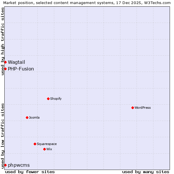 TechnologiesContent ManagementServer-side Languages Client-side Languages JavaScript Libraries CSS Frameworks Web Servers Web Panels Operating Systems Web Hosting Data Centers Reverse Proxies DNS Servers Email Servers SSL Certificate Authorities Content Delivery Traffic Analysis Tools Advertising Networks Tag Managers Social Widgets Site Elements Structured Data Markup Languages Character Encodings Image File Formats Top Level Domains Server Locations Content Languages | Technologies > Content Management > Technology usage comparison Comparison of the usage statistics of PHP-Fusion vs. phpwcms vs. Wagtail for websitesThis report shows the usage statistics of PHP-Fusion vs. phpwcms vs. Wagtail as content management system on the web. See technologies overview for explanations on the methodologies used in the surveys. Our reports are updated daily. Usage and market shareThis diagram shows the percentages of websites using the selected technologies. How to read the diagram: