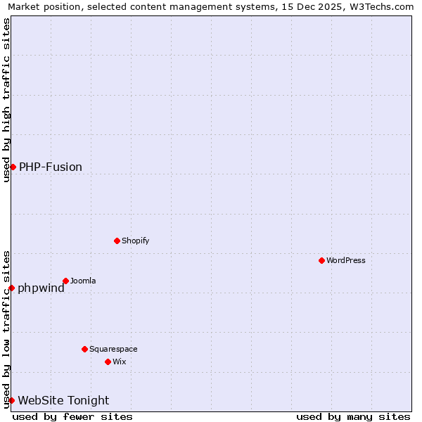TechnologiesContent ManagementServer-side Languages Client-side Languages JavaScript Libraries CSS Frameworks Web Servers Web Panels Operating Systems Web Hosting Data Centers Reverse Proxies DNS Servers Email Servers SSL Certificate Authorities Content Delivery Traffic Analysis Tools Advertising Networks Tag Managers Social Widgets Site Elements Structured Data Markup Languages Character Encodings Image File Formats Top Level Domains Server Locations Content Languages | Technologies > Content Management > Technology usage comparison Comparison of the usage statistics of PHP-Fusion vs. phpwind vs. WebSite Tonight for websitesThis report shows the usage statistics of PHP-Fusion vs. phpwind vs. WebSite Tonight as content management system on the web. See technologies overview for explanations on the methodologies used in the surveys. Our reports are updated daily. Usage and market shareThis diagram shows the percentages of websites using the selected technologies. How to read the diagram: