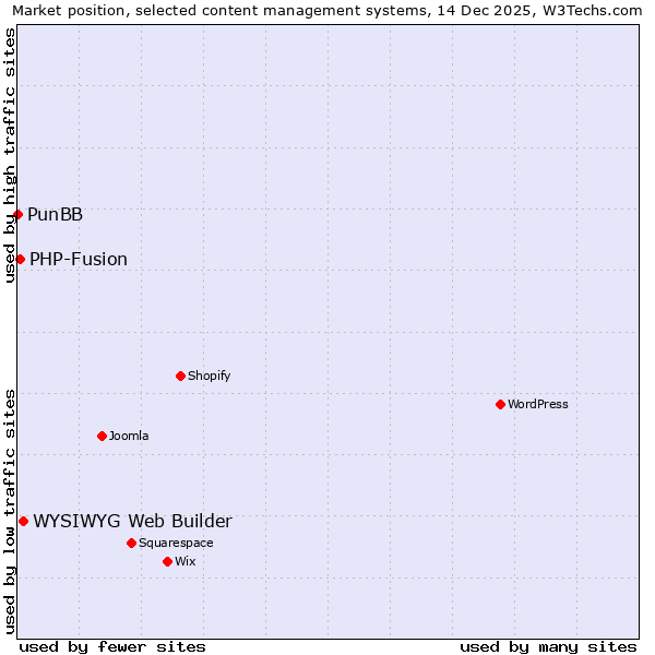 TechnologiesContent ManagementServer-side Languages Client-side Languages JavaScript Libraries CSS Frameworks Web Servers Web Panels Operating Systems Web Hosting Data Centers Reverse Proxies DNS Servers Email Servers SSL Certificate Authorities Content Delivery Traffic Analysis Tools Advertising Networks Tag Managers Social Widgets Site Elements Structured Data Markup Languages Character Encodings Image File Formats Top Level Domains Server Locations Content Languages | Technologies > Content Management > Technology usage comparison Comparison of the usage statistics of WYSIWYG Web Builder vs. PHP-Fusion vs. PunBB for websitesThis report shows the usage statistics of WYSIWYG Web Builder vs. PHP-Fusion vs. PunBB as content management system on the web. See technologies overview for explanations on the methodologies used in the surveys. Our reports are updated daily. Usage and market shareThis diagram shows the percentages of websites using the selected technologies. How to read the diagram: