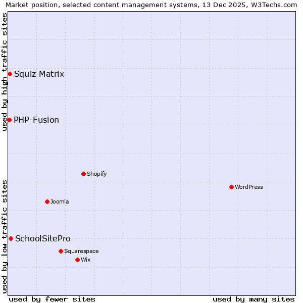 TechnologiesContent ManagementServer-side Languages Client-side Languages JavaScript Libraries CSS Frameworks Web Servers Web Panels Operating Systems Web Hosting Data Centers Reverse Proxies DNS Servers Email Servers SSL Certificate Authorities Content Delivery Traffic Analysis Tools Advertising Networks Tag Managers Social Widgets Site Elements Structured Data Markup Languages Character Encodings Image File Formats Top Level Domains Server Locations Content Languages | Technologies > Content Management > Technology usage comparison Comparison of the usage statistics of SchoolSitePro vs. Squiz Matrix vs. PHP-Fusion for websitesThis report shows the usage statistics of SchoolSitePro vs. Squiz Matrix vs. PHP-Fusion as content management system on the web. See technologies overview for explanations on the methodologies used in the surveys. Our reports are updated daily. Usage and market shareThis diagram shows the percentages of websites using the selected technologies. How to read the diagram: