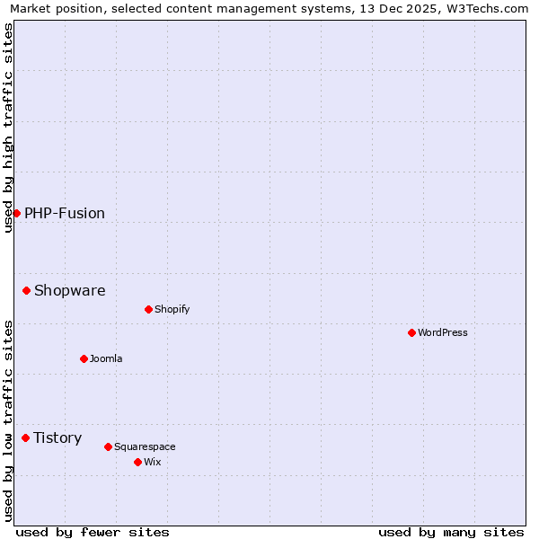 TechnologiesContent ManagementServer-side Languages Client-side Languages JavaScript Libraries CSS Frameworks Web Servers Web Panels Operating Systems Web Hosting Data Centers Reverse Proxies DNS Servers Email Servers SSL Certificate Authorities Content Delivery Traffic Analysis Tools Advertising Networks Tag Managers Social Widgets Site Elements Structured Data Markup Languages Character Encodings Image File Formats Top Level Domains Server Locations Content Languages | Technologies > Content Management > Technology usage comparison Comparison of the usage statistics of Shopware vs. Tistory vs. PHP-Fusion for websitesThis report shows the usage statistics of Shopware vs. Tistory vs. PHP-Fusion as content management system on the web. See technologies overview for explanations on the methodologies used in the surveys. Our reports are updated daily. Usage and market shareThis diagram shows the percentages of websites using the selected technologies. How to read the diagram: