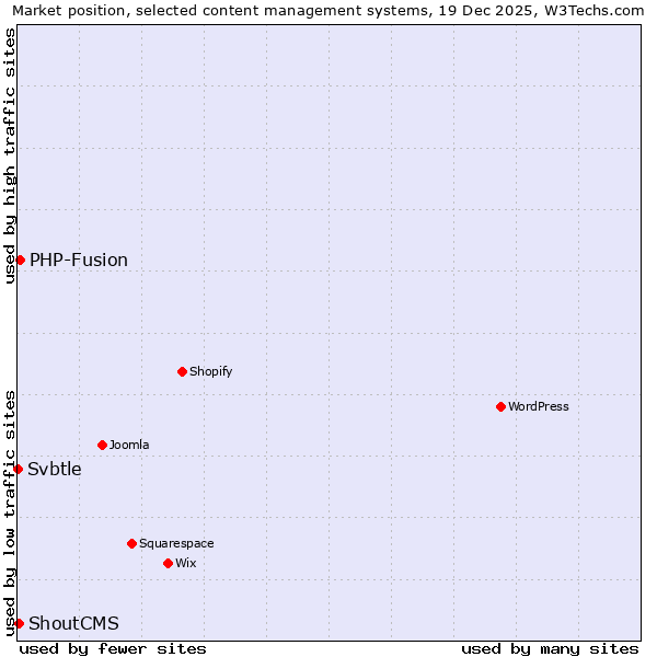 TechnologiesContent ManagementServer-side Languages Client-side Languages JavaScript Libraries CSS Frameworks Web Servers Web Panels Operating Systems Web Hosting Data Centers Reverse Proxies DNS Servers Email Servers SSL Certificate Authorities Content Delivery Traffic Analysis Tools Advertising Networks Tag Managers Social Widgets Site Elements Structured Data Markup Languages Character Encodings Image File Formats Top Level Domains Server Locations Content Languages | Technologies > Content Management > Technology usage comparison Comparison of the usage statistics of PHP-Fusion vs. ShoutCMS vs. Svbtle for websitesThis report shows the usage statistics of PHP-Fusion vs. ShoutCMS vs. Svbtle as content management system on the web. See technologies overview for explanations on the methodologies used in the surveys. Our reports are updated daily. Usage and market shareThis diagram shows the percentages of websites using the selected technologies. How to read the diagram: