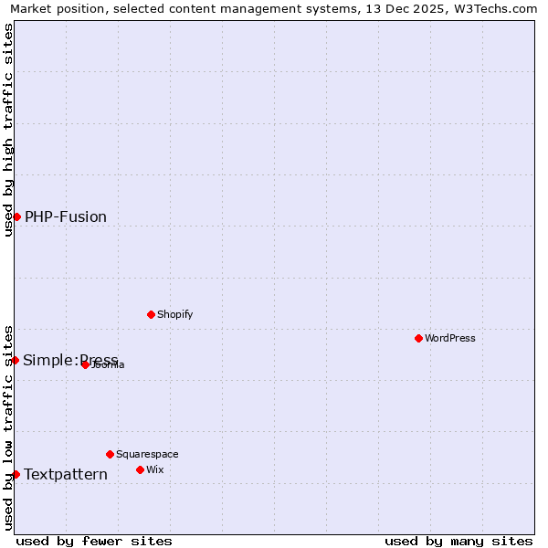 TechnologiesContent ManagementServer-side Languages Client-side Languages JavaScript Libraries CSS Frameworks Web Servers Web Panels Operating Systems Web Hosting Data Centers Reverse Proxies DNS Servers Email Servers SSL Certificate Authorities Content Delivery Traffic Analysis Tools Advertising Networks Tag Managers Social Widgets Site Elements Structured Data Markup Languages Character Encodings Image File Formats Top Level Domains Server Locations Content Languages | Technologies > Content Management > Technology usage comparison Comparison of the usage statistics of PHP-Fusion vs. Textpattern vs. Simple:Press for websitesThis report shows the usage statistics of PHP-Fusion vs. Textpattern vs. Simple:Press as content management system on the web. See technologies overview for explanations on the methodologies used in the surveys. Our reports are updated daily. Usage and market shareThis diagram shows the percentages of websites using the selected technologies. How to read the diagram: