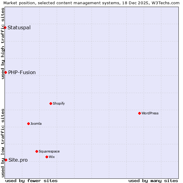 TechnologiesContent ManagementServer-side Languages Client-side Languages JavaScript Libraries CSS Frameworks Web Servers Web Panels Operating Systems Web Hosting Data Centers Reverse Proxies DNS Servers Email Servers SSL Certificate Authorities Content Delivery Traffic Analysis Tools Advertising Networks Tag Managers Social Widgets Site Elements Structured Data Markup Languages Character Encodings Image File Formats Top Level Domains Server Locations Content Languages | Technologies > Content Management > Technology usage comparison Comparison of the usage statistics of Site.pro vs. PHP-Fusion vs. Statuspal for websitesThis report shows the usage statistics of Site.pro vs. PHP-Fusion vs. Statuspal as content management system on the web. See technologies overview for explanations on the methodologies used in the surveys. Our reports are updated daily. Usage and market shareThis diagram shows the percentages of websites using the selected technologies. How to read the diagram: