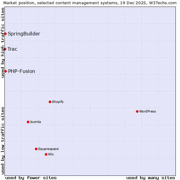 TechnologiesContent ManagementServer-side Languages Client-side Languages JavaScript Libraries CSS Frameworks Web Servers Web Panels Operating Systems Web Hosting Data Centers Reverse Proxies DNS Servers Email Servers SSL Certificate Authorities Content Delivery Traffic Analysis Tools Advertising Networks Tag Managers Social Widgets Site Elements Structured Data Markup Languages Character Encodings Image File Formats Top Level Domains Server Locations Content Languages | Technologies > Content Management > Technology usage comparison Comparison of the usage statistics of PHP-Fusion vs. SpringBuilder vs. Trac for websitesThis report shows the usage statistics of PHP-Fusion vs. SpringBuilder vs. Trac as content management system on the web. See technologies overview for explanations on the methodologies used in the surveys. Our reports are updated daily. Usage and market shareThis diagram shows the percentages of websites using the selected technologies. How to read the diagram: