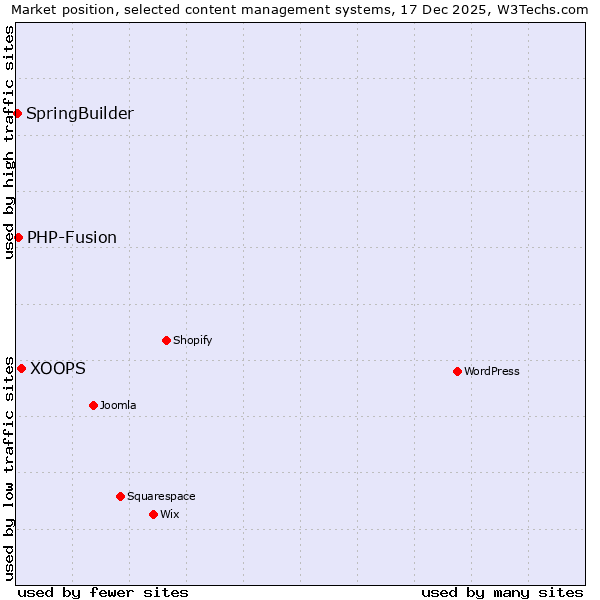 TechnologiesContent ManagementServer-side Languages Client-side Languages JavaScript Libraries CSS Frameworks Web Servers Web Panels Operating Systems Web Hosting Data Centers Reverse Proxies DNS Servers Email Servers SSL Certificate Authorities Content Delivery Traffic Analysis Tools Advertising Networks Tag Managers Social Widgets Site Elements Structured Data Markup Languages Character Encodings Image File Formats Top Level Domains Server Locations Content Languages | Technologies > Content Management > Technology usage comparison Comparison of the usage statistics of XOOPS vs. PHP-Fusion vs. SpringBuilder for websitesThis report shows the usage statistics of XOOPS vs. PHP-Fusion vs. SpringBuilder as content management system on the web. See technologies overview for explanations on the methodologies used in the surveys. Our reports are updated daily. Usage and market shareThis diagram shows the percentages of websites using the selected technologies. How to read the diagram: