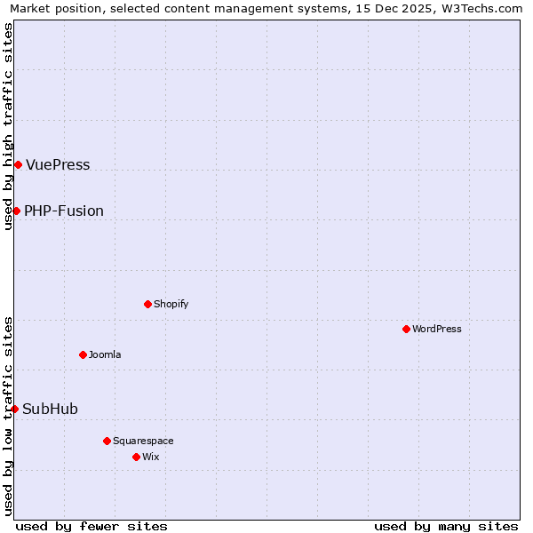 TechnologiesContent ManagementServer-side Languages Client-side Languages JavaScript Libraries CSS Frameworks Web Servers Web Panels Operating Systems Web Hosting Data Centers Reverse Proxies DNS Servers Email Servers SSL Certificate Authorities Content Delivery Traffic Analysis Tools Advertising Networks Tag Managers Social Widgets Site Elements Structured Data Markup Languages Character Encodings Image File Formats Top Level Domains Server Locations Content Languages | Technologies > Content Management > Technology usage comparison Comparison of the usage statistics of VuePress vs. PHP-Fusion vs. SubHub for websitesThis report shows the usage statistics of VuePress vs. PHP-Fusion vs. SubHub as content management system on the web. See technologies overview for explanations on the methodologies used in the surveys. Our reports are updated daily. Usage and market shareThis diagram shows the percentages of websites using the selected technologies. How to read the diagram: