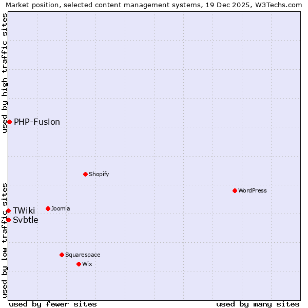 TechnologiesContent ManagementServer-side Languages Client-side Languages JavaScript Libraries CSS Frameworks Web Servers Web Panels Operating Systems Web Hosting Data Centers Reverse Proxies DNS Servers Email Servers SSL Certificate Authorities Content Delivery Traffic Analysis Tools Advertising Networks Tag Managers Social Widgets Site Elements Structured Data Markup Languages Character Encodings Image File Formats Top Level Domains Server Locations Content Languages | Technologies > Content Management > Technology usage comparison Comparison of the usage statistics of PHP-Fusion vs. Svbtle vs. TWiki for websitesThis report shows the usage statistics of PHP-Fusion vs. Svbtle vs. TWiki as content management system on the web. See technologies overview for explanations on the methodologies used in the surveys. Our reports are updated daily. Usage and market shareThis diagram shows the percentages of websites using the selected technologies. How to read the diagram: