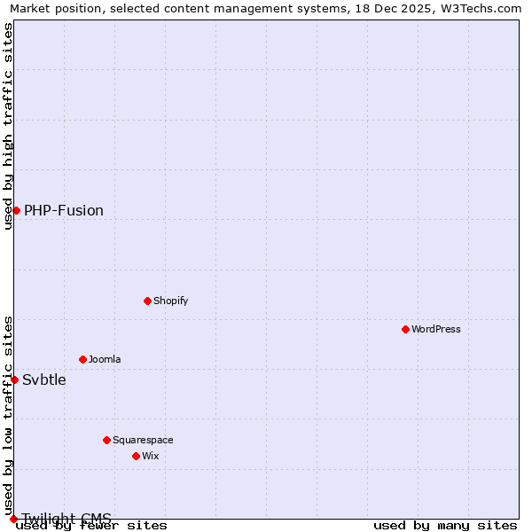 TechnologiesContent ManagementServer-side Languages Client-side Languages JavaScript Libraries CSS Frameworks Web Servers Web Panels Operating Systems Web Hosting Data Centers Reverse Proxies DNS Servers Email Servers SSL Certificate Authorities Content Delivery Traffic Analysis Tools Advertising Networks Tag Managers Social Widgets Site Elements Structured Data Markup Languages Character Encodings Image File Formats Top Level Domains Server Locations Content Languages | Technologies > Content Management > Technology usage comparison Comparison of the usage statistics of PHP-Fusion vs. Svbtle vs. Twilight CMS for websitesThis report shows the usage statistics of PHP-Fusion vs. Svbtle vs. Twilight CMS as content management system on the web. See technologies overview for explanations on the methodologies used in the surveys. Our reports are updated daily. Usage and market shareThis diagram shows the percentages of websites using the selected technologies. How to read the diagram: