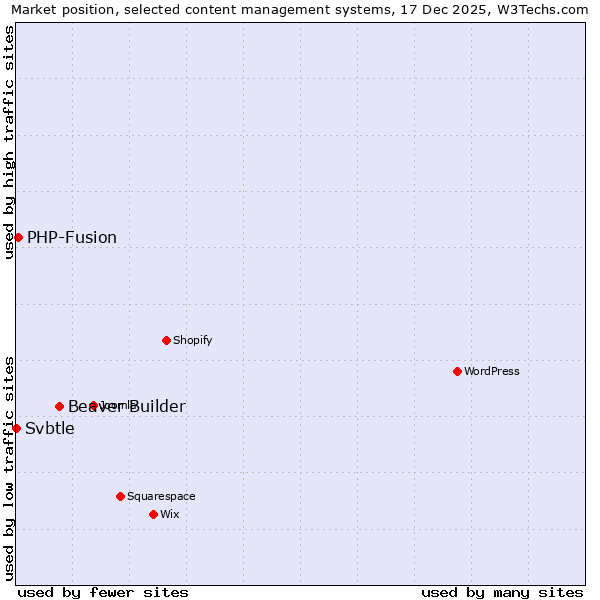 TechnologiesContent ManagementServer-side Languages Client-side Languages JavaScript Libraries CSS Frameworks Web Servers Web Panels Operating Systems Web Hosting Data Centers Reverse Proxies DNS Servers Email Servers SSL Certificate Authorities Content Delivery Traffic Analysis Tools Advertising Networks Tag Managers Social Widgets Site Elements Structured Data Markup Languages Character Encodings Image File Formats Top Level Domains Server Locations Content Languages | Technologies > Content Management > Technology usage comparison Comparison of the usage statistics of Beaver Builder vs. PHP-Fusion vs. Svbtle for websitesThis report shows the usage statistics of Beaver Builder vs. PHP-Fusion vs. Svbtle as content management system on the web. See technologies overview for explanations on the methodologies used in the surveys. Our reports are updated daily. Usage and market shareThis diagram shows the percentages of websites using the selected technologies. How to read the diagram: