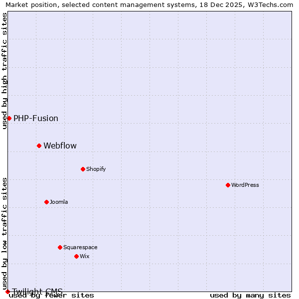 TechnologiesContent ManagementServer-side Languages Client-side Languages JavaScript Libraries CSS Frameworks Web Servers Web Panels Operating Systems Web Hosting Data Centers Reverse Proxies DNS Servers Email Servers SSL Certificate Authorities Content Delivery Traffic Analysis Tools Advertising Networks Tag Managers Social Widgets Site Elements Structured Data Markup Languages Character Encodings Image File Formats Top Level Domains Server Locations Content Languages | Technologies > Content Management > Technology usage comparison Comparison of the usage statistics of Webflow vs. PHP-Fusion vs. Twilight CMS for websitesThis report shows the usage statistics of Webflow vs. PHP-Fusion vs. Twilight CMS as content management system on the web. See technologies overview for explanations on the methodologies used in the surveys. Our reports are updated daily. Usage and market shareThis diagram shows the percentages of websites using the selected technologies. How to read the diagram: