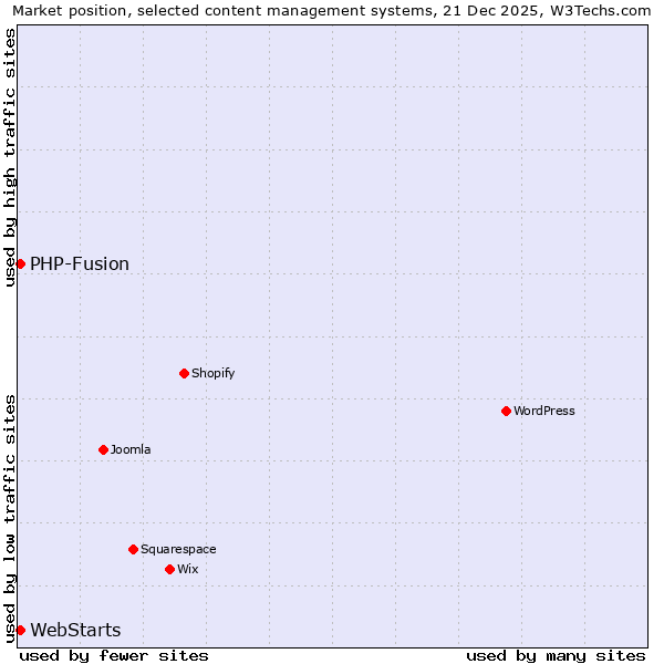 TechnologiesContent ManagementServer-side Languages Client-side Languages JavaScript Libraries CSS Frameworks Web Servers Web Panels Operating Systems Web Hosting Data Centers Reverse Proxies DNS Servers Email Servers SSL Certificate Authorities Content Delivery Traffic Analysis Tools Advertising Networks Tag Managers Social Widgets Site Elements Structured Data Markup Languages Character Encodings Image File Formats Top Level Domains Server Locations Content Languages ComparisonCompare with other | Technologies > Content Management > Technology usage comparison Comparison of the usage statistics of WebStarts vs. PHP-Fusion for websitesThis report shows the usage statistics of WebStarts vs. PHP-Fusion as content management system on the web. See technologies overview for explanations on the methodologies used in the surveys. Our reports are updated daily. Usage and market shareThis diagram shows the percentages of websites using the selected technologies. How to read the diagram: