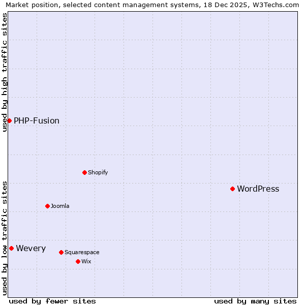 TechnologiesContent ManagementServer-side Languages Client-side Languages JavaScript Libraries CSS Frameworks Web Servers Web Panels Operating Systems Web Hosting Data Centers Reverse Proxies DNS Servers Email Servers SSL Certificate Authorities Content Delivery Traffic Analysis Tools Advertising Networks Tag Managers Social Widgets Site Elements Structured Data Markup Languages Character Encodings Image File Formats Top Level Domains Server Locations Content Languages | Technologies > Content Management > Technology usage comparison Comparison of the usage statistics of WordPress vs. Wevery vs. PHP-Fusion for websitesThis report shows the usage statistics of WordPress vs. Wevery vs. PHP-Fusion as content management system on the web. See technologies overview for explanations on the methodologies used in the surveys. Our reports are updated daily. Usage and market shareThis diagram shows the percentages of websites using the selected technologies. How to read the diagram: