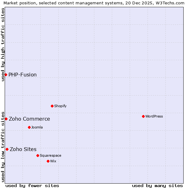 TechnologiesContent ManagementServer-side Languages Client-side Languages JavaScript Libraries CSS Frameworks Web Servers Web Panels Operating Systems Web Hosting Data Centers Reverse Proxies DNS Servers Email Servers SSL Certificate Authorities Content Delivery Traffic Analysis Tools Advertising Networks Tag Managers Social Widgets Site Elements Structured Data Markup Languages Character Encodings Image File Formats Top Level Domains Server Locations Content Languages | Technologies > Content Management > Technology usage comparison Comparison of the usage statistics of Zoho Sites vs. Zoho Commerce vs. PHP-Fusion for websitesThis report shows the usage statistics of Zoho Sites vs. Zoho Commerce vs. PHP-Fusion as content management system on the web. See technologies overview for explanations on the methodologies used in the surveys. Our reports are updated daily. Usage and market shareThis diagram shows the percentages of websites using the selected technologies. How to read the diagram: