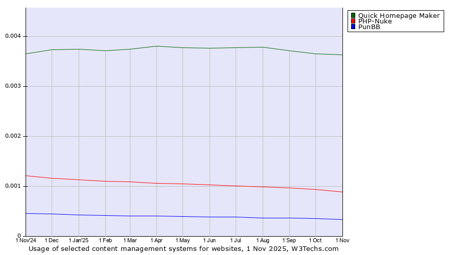 TechnologiesContent ManagementServer-side Languages Client-side Languages JavaScript Libraries CSS Frameworks Web Servers Web Panels Operating Systems Web Hosting Data Centers Reverse Proxies DNS Servers Email Servers SSL Certificate Authorities Content Delivery Traffic Analysis Tools Advertising Networks Tag Managers Social Widgets Site Elements Structured Data Markup Languages Character Encodings Image File Formats Top Level Domains Server Locations Content Languages | Technologies > Content Management > Technology usage comparison Comparison of the usage statistics of Quick Homepage Maker vs. PHP-Nuke vs. PunBB for websitesThis report shows the usage statistics of Quick Homepage Maker vs. PHP-Nuke vs. PunBB as content management system on the web. See technologies overview for explanations on the methodologies used in the surveys. Our reports are updated daily. Usage and market shareThis diagram shows the percentages of websites using the selected technologies. How to read the diagram: