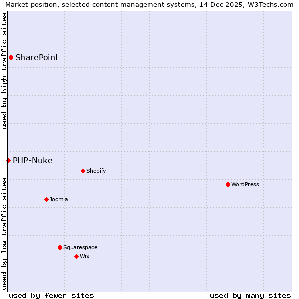 TechnologiesContent ManagementServer-side Languages Client-side Languages JavaScript Libraries CSS Frameworks Web Servers Web Panels Operating Systems Web Hosting Data Centers Reverse Proxies DNS Servers Email Servers SSL Certificate Authorities Content Delivery Traffic Analysis Tools Advertising Networks Tag Managers Social Widgets Site Elements Structured Data Markup Languages Character Encodings Image File Formats Top Level Domains Server Locations Content Languages ComparisonCompare with other | Technologies > Content Management > Technology usage comparison Comparison of the usage statistics of SharePoint vs. PHP-Nuke for websitesThis report shows the usage statistics of SharePoint vs. PHP-Nuke as content management system on the web. See technologies overview for explanations on the methodologies used in the surveys. Our reports are updated daily. Usage and market shareThis diagram shows the percentages of websites using the selected technologies. How to read the diagram: