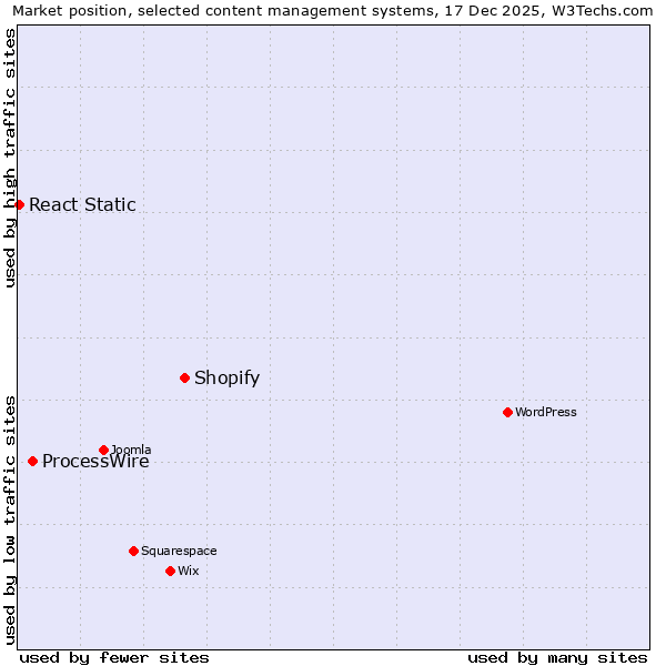 TechnologiesContent ManagementServer-side Languages Client-side Languages JavaScript Libraries CSS Frameworks Web Servers Web Panels Operating Systems Web Hosting Data Centers Reverse Proxies DNS Servers Email Servers SSL Certificate Authorities Content Delivery Traffic Analysis Tools Advertising Networks Tag Managers Social Widgets Site Elements Structured Data Markup Languages Character Encodings Image File Formats Top Level Domains Server Locations Content Languages | Technologies > Content Management > Technology usage comparison Comparison of the usage statistics of Shopify vs. ProcessWire vs. React Static for websitesThis report shows the usage statistics of Shopify vs. ProcessWire vs. React Static as content management system on the web. See technologies overview for explanations on the methodologies used in the surveys. Our reports are updated daily. Usage and market shareThis diagram shows the percentages of websites using the selected technologies. How to read the diagram: