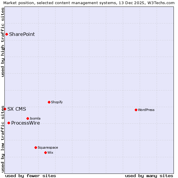 TechnologiesContent ManagementServer-side Languages Client-side Languages JavaScript Libraries CSS Frameworks Web Servers Web Panels Operating Systems Web Hosting Data Centers Reverse Proxies DNS Servers Email Servers SSL Certificate Authorities Content Delivery Traffic Analysis Tools Advertising Networks Tag Managers Social Widgets Site Elements Structured Data Markup Languages Character Encodings Image File Formats Top Level Domains Server Locations Content Languages | Technologies > Content Management > Technology usage comparison Comparison of the usage statistics of ProcessWire vs. SharePoint vs. SX CMS for websitesThis report shows the usage statistics of ProcessWire vs. SharePoint vs. SX CMS as content management system on the web. See technologies overview for explanations on the methodologies used in the surveys. Our reports are updated daily. Usage and market shareThis diagram shows the percentages of websites using the selected technologies. How to read the diagram: