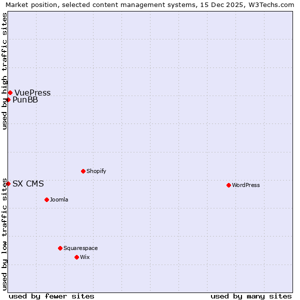 TechnologiesContent ManagementServer-side Languages Client-side Languages JavaScript Libraries CSS Frameworks Web Servers Web Panels Operating Systems Web Hosting Data Centers Reverse Proxies DNS Servers Email Servers SSL Certificate Authorities Content Delivery Traffic Analysis Tools Advertising Networks Tag Managers Social Widgets Site Elements Structured Data Markup Languages Character Encodings Image File Formats Top Level Domains Server Locations Content Languages | Technologies > Content Management > Technology usage comparison Comparison of the usage statistics of VuePress vs. PunBB vs. SX CMS for websitesThis report shows the usage statistics of VuePress vs. PunBB vs. SX CMS as content management system on the web. See technologies overview for explanations on the methodologies used in the surveys. Our reports are updated daily. Usage and market shareThis diagram shows the percentages of websites using the selected technologies. How to read the diagram: