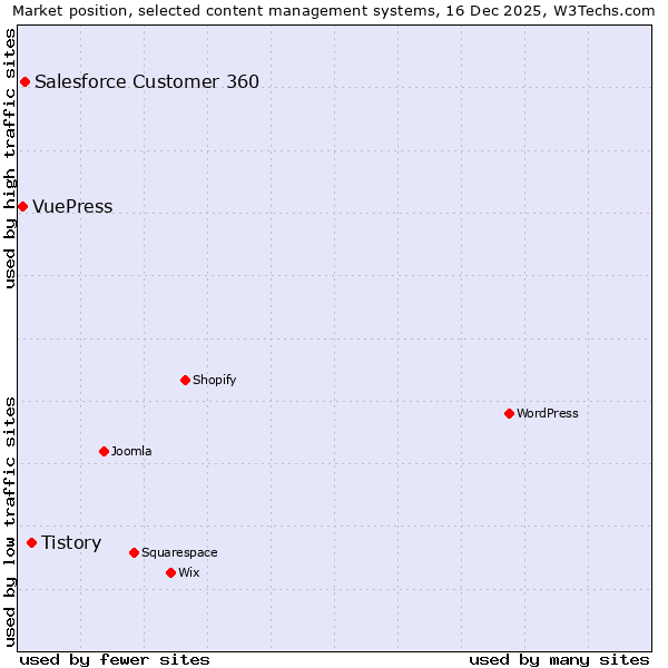 TechnologiesContent ManagementServer-side Languages Client-side Languages JavaScript Libraries CSS Frameworks Web Servers Web Panels Operating Systems Web Hosting Data Centers Reverse Proxies DNS Servers Email Servers SSL Certificate Authorities Content Delivery Traffic Analysis Tools Advertising Networks Tag Managers Social Widgets Site Elements Structured Data Markup Languages Character Encodings Image File Formats Top Level Domains Server Locations Content Languages | Technologies > Content Management > Technology usage comparison Comparison of the usage statistics of Tistory vs. Salesforce Customer 360 vs. VuePress for websitesThis report shows the usage statistics of Tistory vs. Salesforce Customer 360 vs. VuePress as content management system on the web. See technologies overview for explanations on the methodologies used in the surveys. Our reports are updated daily. Usage and market shareThis diagram shows the percentages of websites using the selected technologies. How to read the diagram: