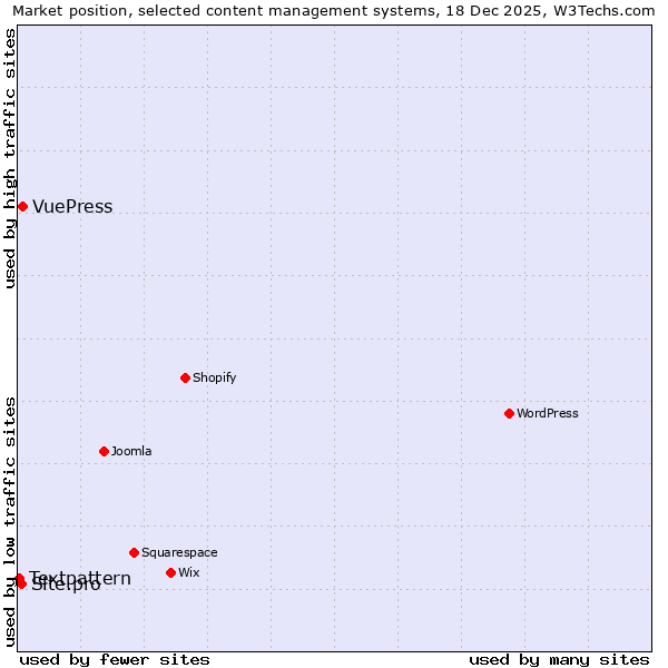 TechnologiesContent ManagementServer-side Languages Client-side Languages JavaScript Libraries CSS Frameworks Web Servers Web Panels Operating Systems Web Hosting Data Centers Reverse Proxies DNS Servers Email Servers SSL Certificate Authorities Content Delivery Traffic Analysis Tools Advertising Networks Tag Managers Social Widgets Site Elements Structured Data Markup Languages Character Encodings Image File Formats Top Level Domains Server Locations Content Languages | Technologies > Content Management > Technology usage comparison Comparison of the usage statistics of VuePress vs. Site.pro vs. Textpattern for websitesThis report shows the usage statistics of VuePress vs. Site.pro vs. Textpattern as content management system on the web. See technologies overview for explanations on the methodologies used in the surveys. Our reports are updated daily. Usage and market shareThis diagram shows the percentages of websites using the selected technologies. How to read the diagram: