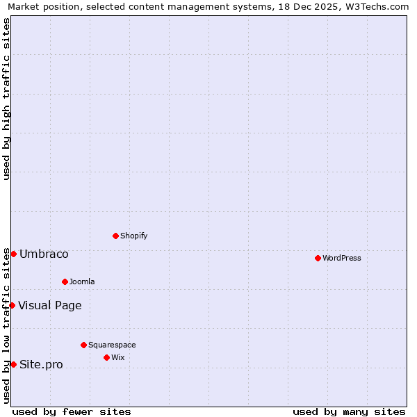 TechnologiesContent ManagementServer-side Languages Client-side Languages JavaScript Libraries CSS Frameworks Web Servers Web Panels Operating Systems Web Hosting Data Centers Reverse Proxies DNS Servers Email Servers SSL Certificate Authorities Content Delivery Traffic Analysis Tools Advertising Networks Tag Managers Social Widgets Site Elements Structured Data Markup Languages Character Encodings Image File Formats Top Level Domains Server Locations Content Languages | Technologies > Content Management > Technology usage comparison Comparison of the usage statistics of Umbraco vs. Site.pro vs. Visual Page for websitesThis report shows the usage statistics of Umbraco vs. Site.pro vs. Visual Page as content management system on the web. See technologies overview for explanations on the methodologies used in the surveys. Our reports are updated daily. Usage and market shareThis diagram shows the percentages of websites using the selected technologies. How to read the diagram: