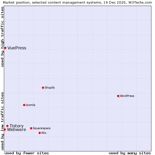 TechnologiesContent ManagementServer-side Languages Client-side Languages JavaScript Libraries CSS Frameworks Web Servers Web Panels Operating Systems Web Hosting Data Centers Reverse Proxies DNS Servers Email Servers SSL Certificate Authorities Content Delivery Traffic Analysis Tools Advertising Networks Tag Managers Social Widgets Site Elements Structured Data Markup Languages Character Encodings Image File Formats Top Level Domains Server Locations Content Languages | Technologies > Content Management > Technology usage comparison Comparison of the usage statistics of Tistory vs. VuePress vs. Webware for websitesThis report shows the usage statistics of Tistory vs. VuePress vs. Webware as content management system on the web. See technologies overview for explanations on the methodologies used in the surveys. Our reports are updated daily. Usage and market shareThis diagram shows the percentages of websites using the selected technologies. How to read the diagram:
