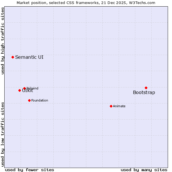 TechnologiesContent ManagementServer-side Languages Client-side Languages JavaScript Libraries CSS Frameworks Web Servers Web Panels Operating Systems Web Hosting Data Centers Reverse Proxies DNS Servers Email Servers SSL Certificate Authorities Content Delivery Traffic Analysis Tools Advertising Networks Tag Managers Social Widgets Site Elements Structured Data Markup Languages Character Encodings Image File Formats Top Level Domains Server Locations Content Languages | Technologies > CSS Frameworks > Technology usage comparison Comparison of the usage statistics of Bootstrap vs. UIkit vs. Semantic UI for websitesThis report shows the usage statistics of Bootstrap vs. UIkit vs. Semantic UI as CSS framework on the web. See technologies overview for explanations on the methodologies used in the surveys. Our reports are updated daily. Usage and market shareThis diagram shows the percentages of websites using the selected technologies. How to read the diagram: