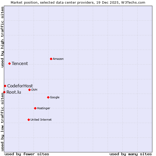 TechnologiesContent ManagementServer-side Languages Client-side Languages JavaScript Libraries CSS Frameworks Web Servers Web Panels Operating Systems Web Hosting Data Centers Reverse Proxies DNS Servers Email Servers SSL Certificate Authorities Content Delivery Traffic Analysis Tools Advertising Networks Tag Managers Social Widgets Site Elements Structured Data Markup Languages Character Encodings Image File Formats Top Level Domains Server Locations Content Languages | Technologies > Data Centers > Technology usage comparison Comparison of the usage statistics of Tencent vs. CodeforHost vs. Root.lu for websitesThis report shows the usage statistics of Tencent vs. CodeforHost vs. Root.lu as data center provider on the web. See technologies overview for explanations on the methodologies used in the surveys. Our reports are updated daily. UsageThis diagram shows the percentages of websites using the selected technologies. How to read the diagram: