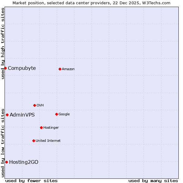 TechnologiesContent ManagementServer-side Languages Client-side Languages JavaScript Libraries CSS Frameworks Web Servers Web Panels Operating Systems Web Hosting Data Centers Reverse Proxies DNS Servers Email Servers SSL Certificate Authorities Content Delivery Traffic Analysis Tools Advertising Networks Tag Managers Social Widgets Site Elements Structured Data Markup Languages Character Encodings Image File Formats Top Level Domains Server Locations Content Languages | Technologies > Data Centers > Technology usage comparison Comparison of the usage statistics of AdminVPS vs. Hosting2GO vs. Compubyte for websitesThis report shows the usage statistics of AdminVPS vs. Hosting2GO vs. Compubyte as data center provider on the web. See technologies overview for explanations on the methodologies used in the surveys. Our reports are updated daily. UsageThis diagram shows the percentages of websites using the selected technologies. How to read the diagram: