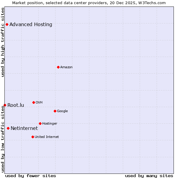 TechnologiesContent ManagementServer-side Languages Client-side Languages JavaScript Libraries CSS Frameworks Web Servers Web Panels Operating Systems Web Hosting Data Centers Reverse Proxies DNS Servers Email Servers SSL Certificate Authorities Content Delivery Traffic Analysis Tools Advertising Networks Tag Managers Social Widgets Site Elements Structured Data Markup Languages Character Encodings Image File Formats Top Level Domains Server Locations Content Languages | Technologies > Data Centers > Technology usage comparison Comparison of the usage statistics of Netinternet vs. Advanced Hosting vs. Root.lu for websitesThis report shows the usage statistics of Netinternet vs. Advanced Hosting vs. Root.lu as data center provider on the web. See technologies overview for explanations on the methodologies used in the surveys. Our reports are updated daily. UsageThis diagram shows the percentages of websites using the selected technologies. How to read the diagram: